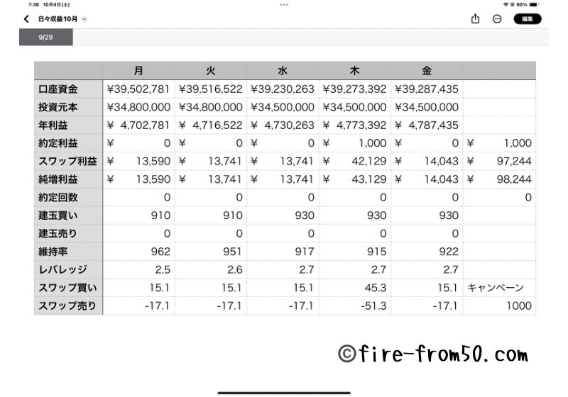 スワップは土日を含め3日分ついて42,129円。(10,000通貨あたりロング15.1円ショート−17.1円)