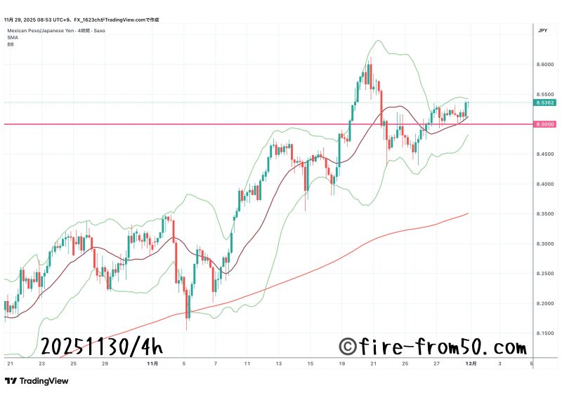 ドル円が160円近くまで迫ってきたこともあり為替介入が警戒され、メキシコペソ円も8.500ラインで停滞。