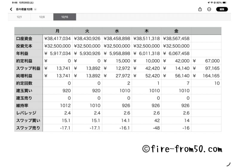 スワップは土日を含め3日分ついて42,420円(10,000通貨あたりロング14.0円ショート−16.0円)